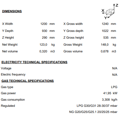 "- Stamped surface tops, manufactured in 2 mm thick AISI-304 stainless steel. - Laser-cut joints, automatic welding and polishes. Screws hidden from view. - Hobs with dimensions 397 x 350 mm allowing the use of large pans and pots. The shortened distance between the central prongs, 75 mm, allows them to support pans with a very small diameter (8 cm). This also avoids the danger of small containers tipping over. - The hobs are manufactured in RAAF enamelled cast iron (resistant to acid and alkali products, and to fire and high temperatures). - Double crown burners and diffusers in nickel-plated cast iron, guaranteeing the even distribution of heat from the flame in the bottom of the pans, even large ones. This avoids the accumulation of heat at a single point and optimises the energy transfer of the product. - Burners slot back in with no way of confusing their position. - Low consumption pilots and thermocouples positioned within the body of the burner for greater protection. - Gas conduction in flexible stainless steel tubes, making internal manipulation easier and facilitating any repair work. - Controls set on a protective base with a system against water infiltration. - High temperature enamelled cast iron flue protector aligned with the hobs, facilitating manoeuverability and supporting larger containers, increasing useful surface area. - Access to the components from the front. -Machines with IPX5 grade water protection" POSSIBLE ACCESSORIES : - STANDS 900 - REFRIGERATED STANDS - ACCESSORIES KORE - COOKER ACCESSORIES KORE - KORE WHEELS - TALL CHIMNEY KORE