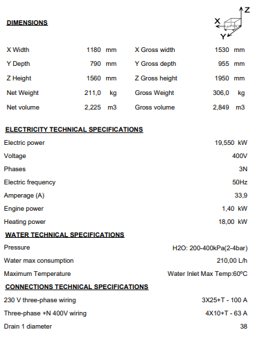 DENOMINATION: Compact rack conveyor 120 racks/hour with entrance from the feft for hot water DESCRIPTION : "- All the main parts are manufactured in AISI-304 anti-corrosion stainless steel: tanks, washing and rinsing arms, rinsing jets, doors, basket conveyance system, boiler and metal tubes. - Upwards-opening double panel door. - Tank tray filters made of AISI-304 stainless steel, easy to access and remove for cleaning and access to the tank. - Safety filter for pump suction. - Rinsing boiler with heat insulation. - Easy access for installation. Electrovalve located on one side (no need to remove panels to connect the machine). - Electrical panel designed for easy connection of dosers for liquid and solid detergents, rinse aid, limit switches, supplementary emergency stop button. - Washing arms easily removable as a set, for cleaning, with a plug on each branch providing access for cleaning inside. - Rinse jets easily dismountable and removable. - System of electronic regulation of speeds by means of frequency shifter. - Configurable electronic temperature control: - Wash (50 - 65 °C) - Rinse (70 - 85 °C) - Guarantor of rinse at 85 °C. - Pressure regulator for flow control. - Emergency stop button incorporated. - Extra anti-entrapment protection system at the entrance, mounted on the AS-260 splash guard supplement (optional). - Open door blocking system. - IPX4 protection system. - System for detection of blockage of conveyor carriage and automatic reverse function. - Energy-saving system: reduces consumption by halting operation of the pumps, and by passing the heating of the rinse to stand-by mode (70 °C). - Auto-timer which deactivates the conveyor motor after a pre-set period of inactivity (10 minutes)." - High-power washing system with 4 upper and 4 lower washing branches. - Double effect rinse. - 3 programs 80, 100 and 120 baskets/hour. Entry through the left part of the machine. HW: Model prepared for connection with hot water from the network (input temperature> 50 ºC.). POSSIBLE OPTIONS : - Electric trasformation to 230V three-phase without neutral (230V 3 ~) - Electric trasformation to marine version (440V 3~ 60 Hz.) - Drying tunnel - Anti-splash guard supplement (enter) - Anti-splash guard supplement (exit) POSSIBLE ACCESSORIES : - BASKETS - BASKETS FOR DISHWASHERS - BASKETS FOR GLASSES - MODULAR ELEMENTS - TABLES FOR RACK TYPE DISHWASH. SUPPLIED ACCESSORIES: - 19000484 Glass basket, 500x500x110 mm. 2 - 19000487 Basket for 16-18 plates, 500x500x110 mm. 2 - 19000488 Baskets for 16 glasses and cups with 110 mm diameter and 100 mm
